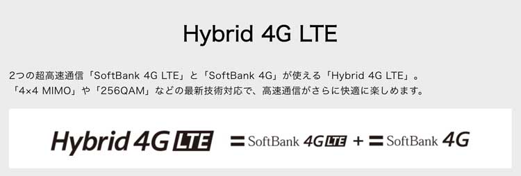 「Hybrid 4G LTE」は、「SoftBank 4G LTE」と「SoftBank 4G」の2つの超高速通信を組み合わせることで、安定で高速なネット通信を実現しているというものです。