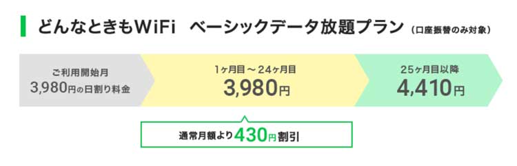 どんなときもWiFiは2年間は月額3,480円(税抜)ですが、2年後からは月額3,980円(税抜)と、500円高くなります。