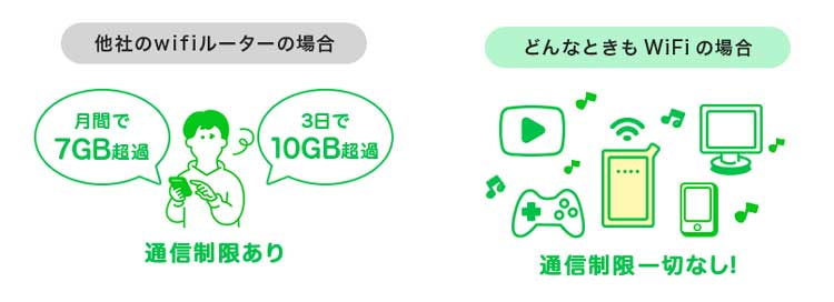 どんなときもWiFiには速度制限や通信量制限など、通信に関わる制約が全くありません。