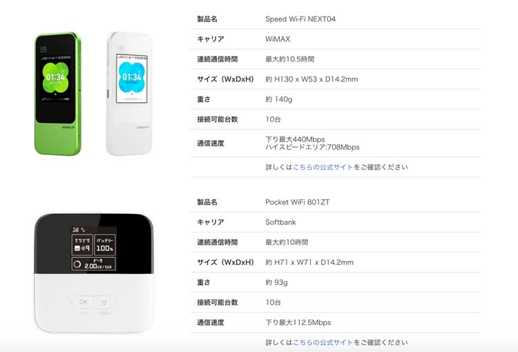 Speed Wi-Fi NEXT04(WiMAX)、Pocket WiFi 801ZT(Softbank)どちらかの端末をお届けいたします。