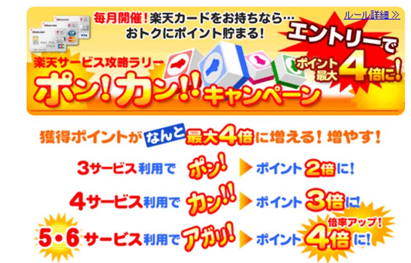 と思うけど簡単に言うと、楽天のサービスを使うと、その分ポイント2倍3倍4倍になるよ! というもの! ちなみに対象になるのは