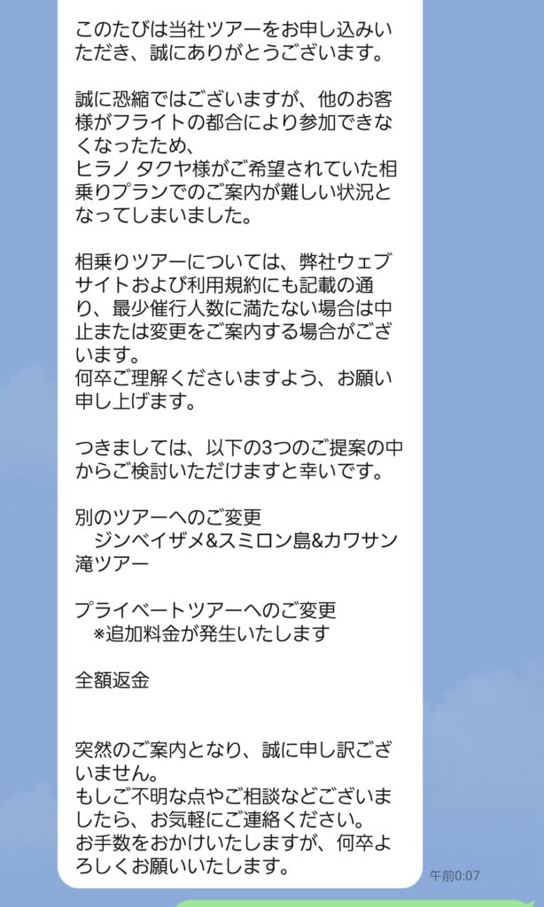 長いので簡単に言うと、最少人数に達してないからプランを変えろという連絡