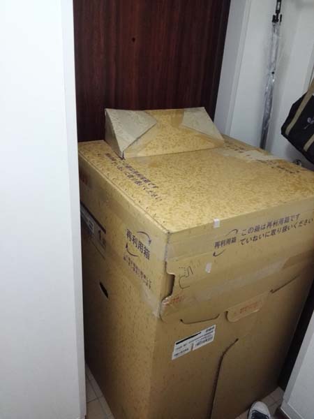 ちなみにこんな感じでクソデカ段ボールで登場します(アメ降ってたので少し濡れてます)