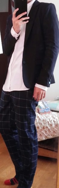 比較的カッチリしたコーディネートです。これくらいシンプルなコーディネートは柄がないと寂しくなってしまうのでボトムスでウインドーペン柄を入れてみました。とりあえず間違いない!なコーディネートです。