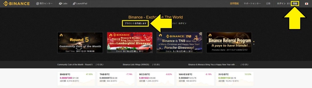 なんと、このBINANCE2017年12月にかつて一位だったBittrexを抜かして世界一位の取引高を記録しました!(競争が激しいので入れ替わりも行われてますが)