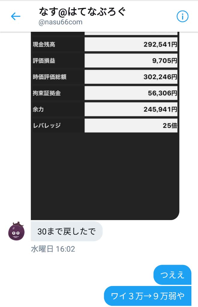 この時点で暴落を恐れてノーポジワイと、全力のっかりなすさん。さらに差は開いていく