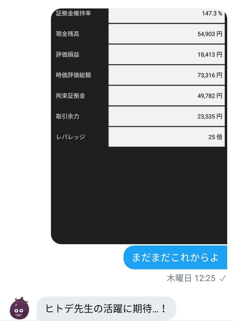 かなり投機的な、完全なお遊びでしたが二人とも利益出まくって良かったです。どちらもほぼド素人なのに勝てるってヤバいですよね(何回も死にかけたけど)