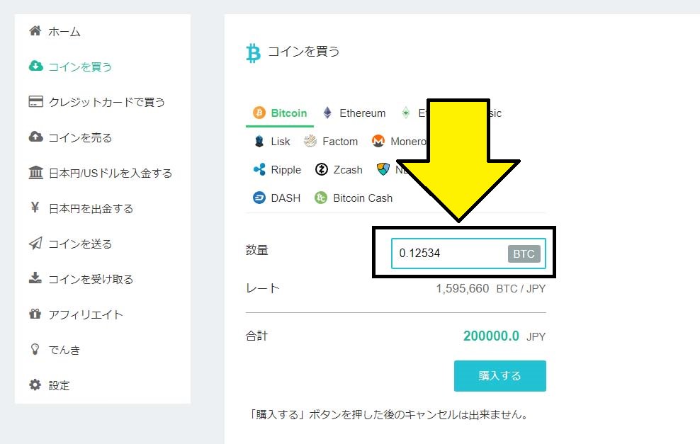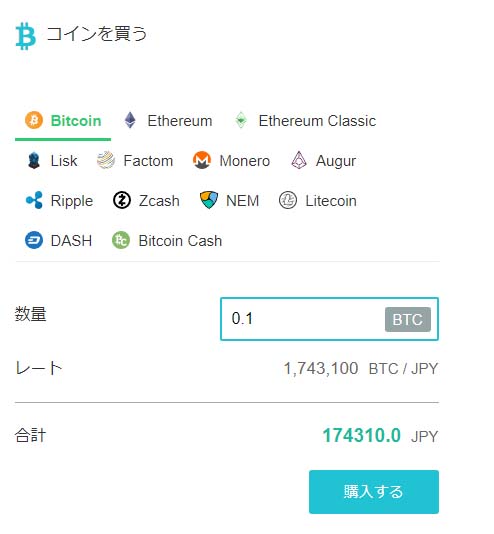 ちなみに上にある「コインを買う」の部分でBitcoin以外の所を選べば同様に他の通貨も購入できます
